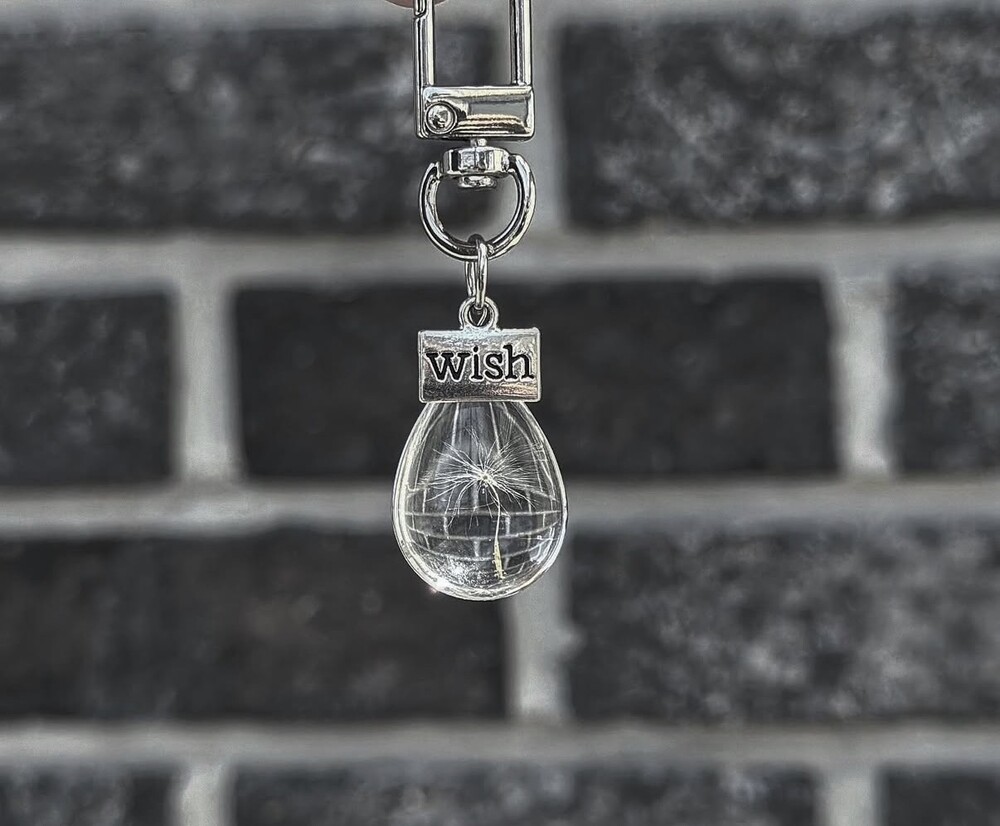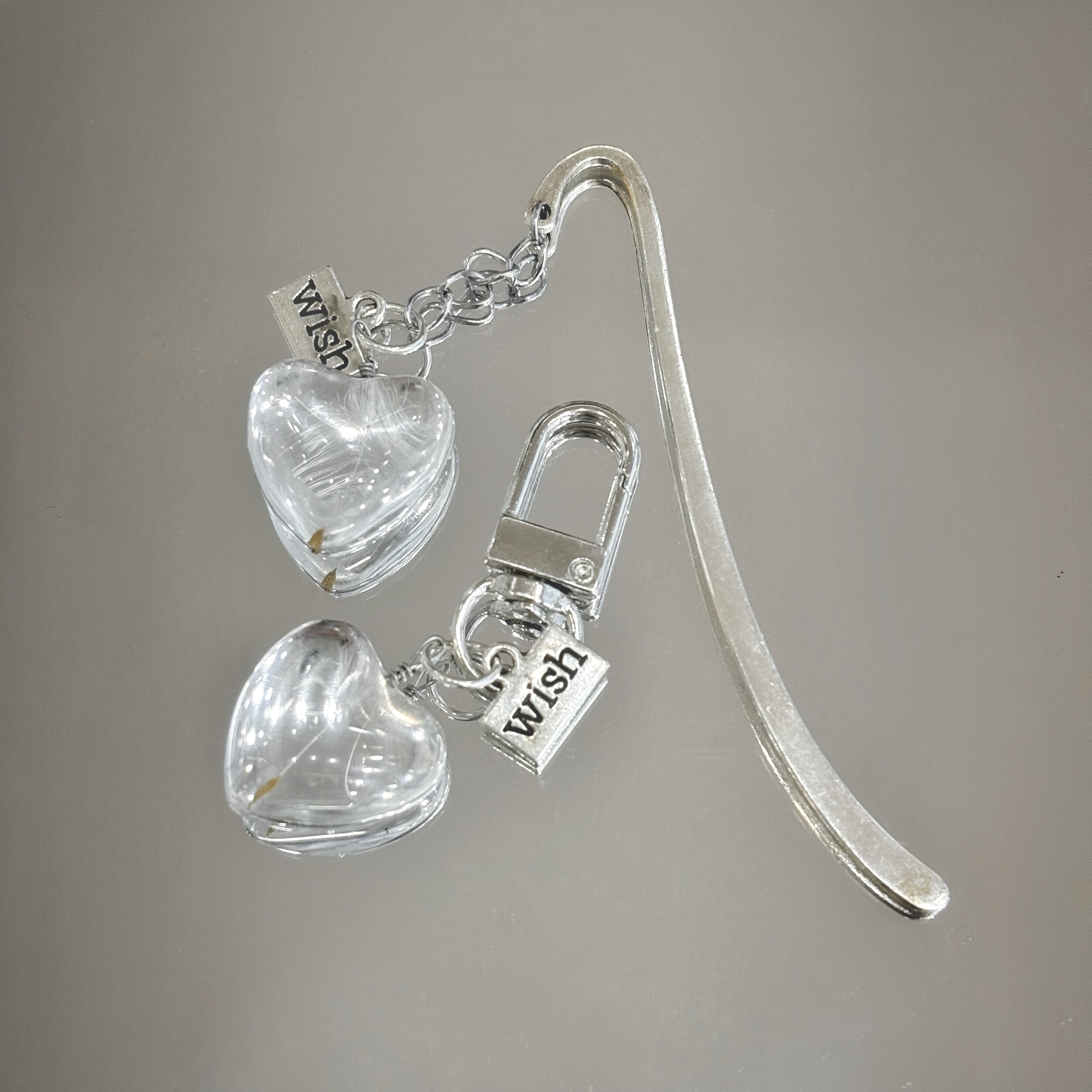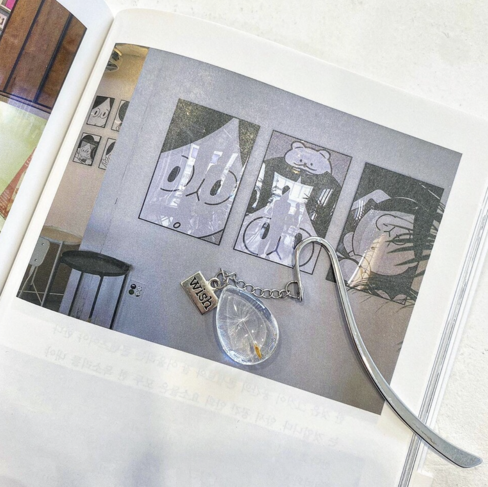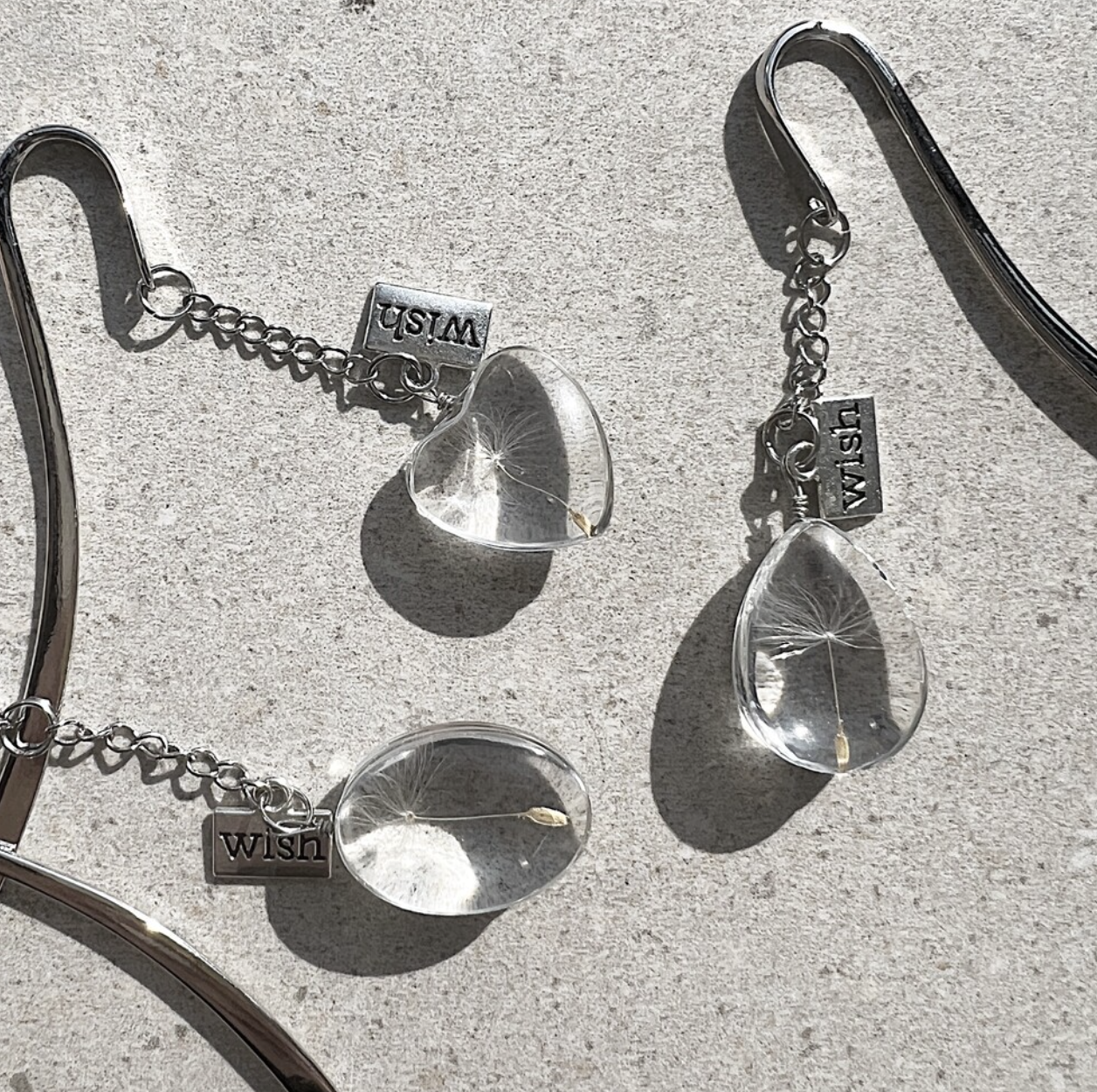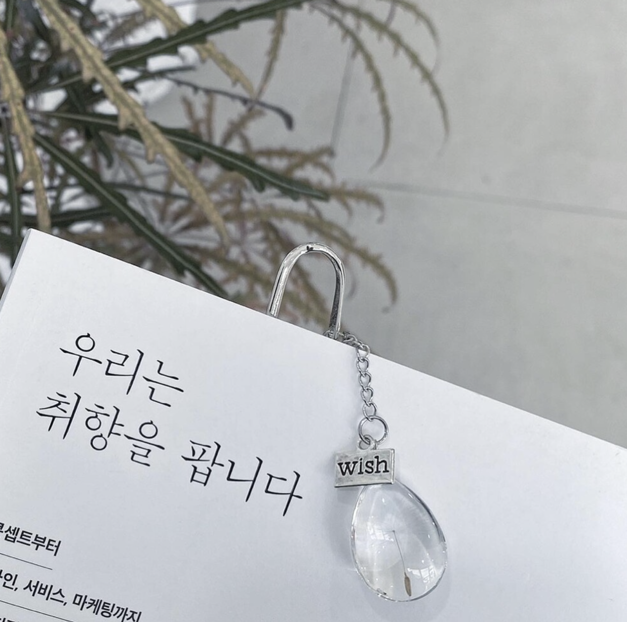 훅 불면 날아갈 듯한 민들레 홀씨를 영원히 담은 흰백의 키링과 책갈피를 하나의 세트로 구성했습니다.